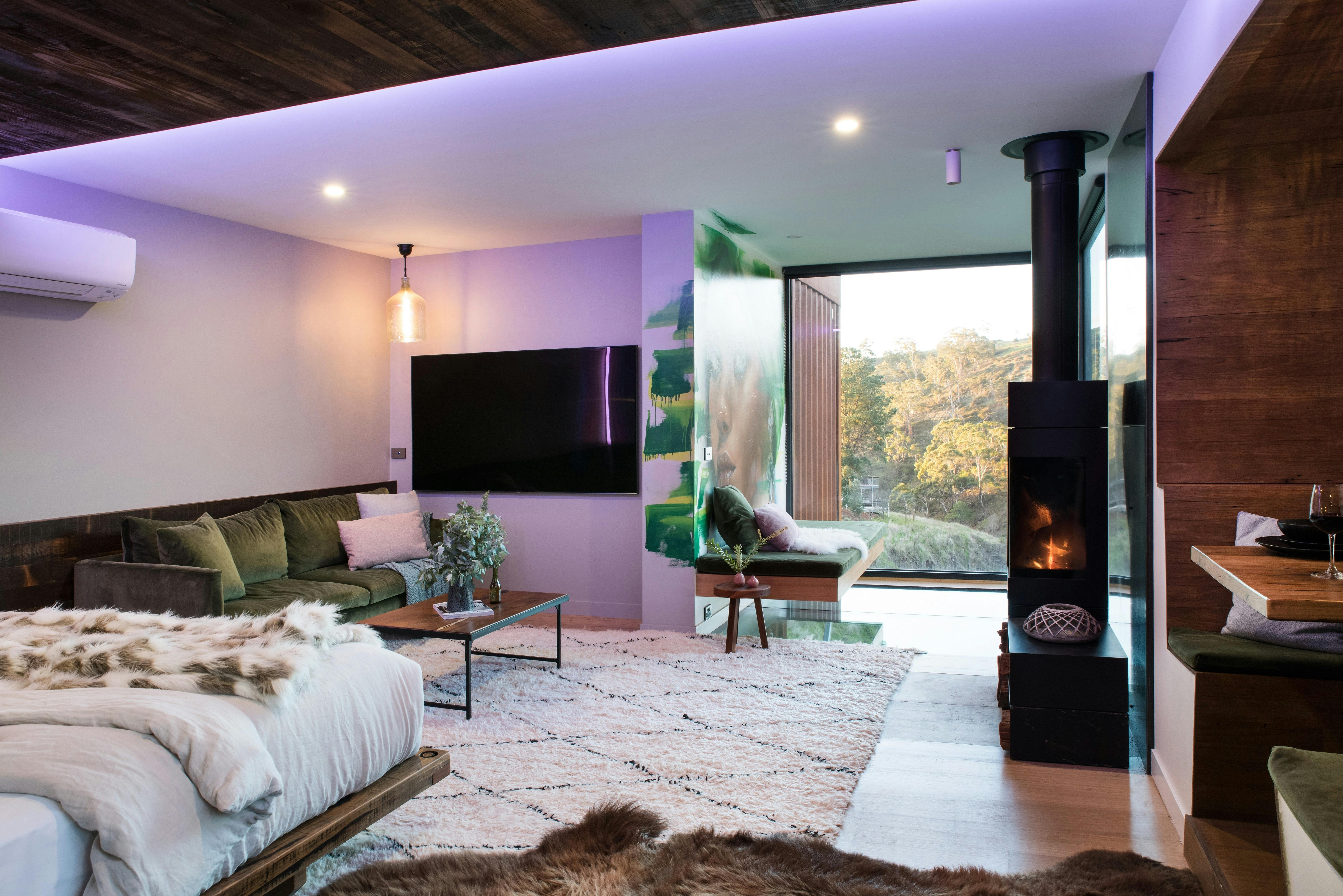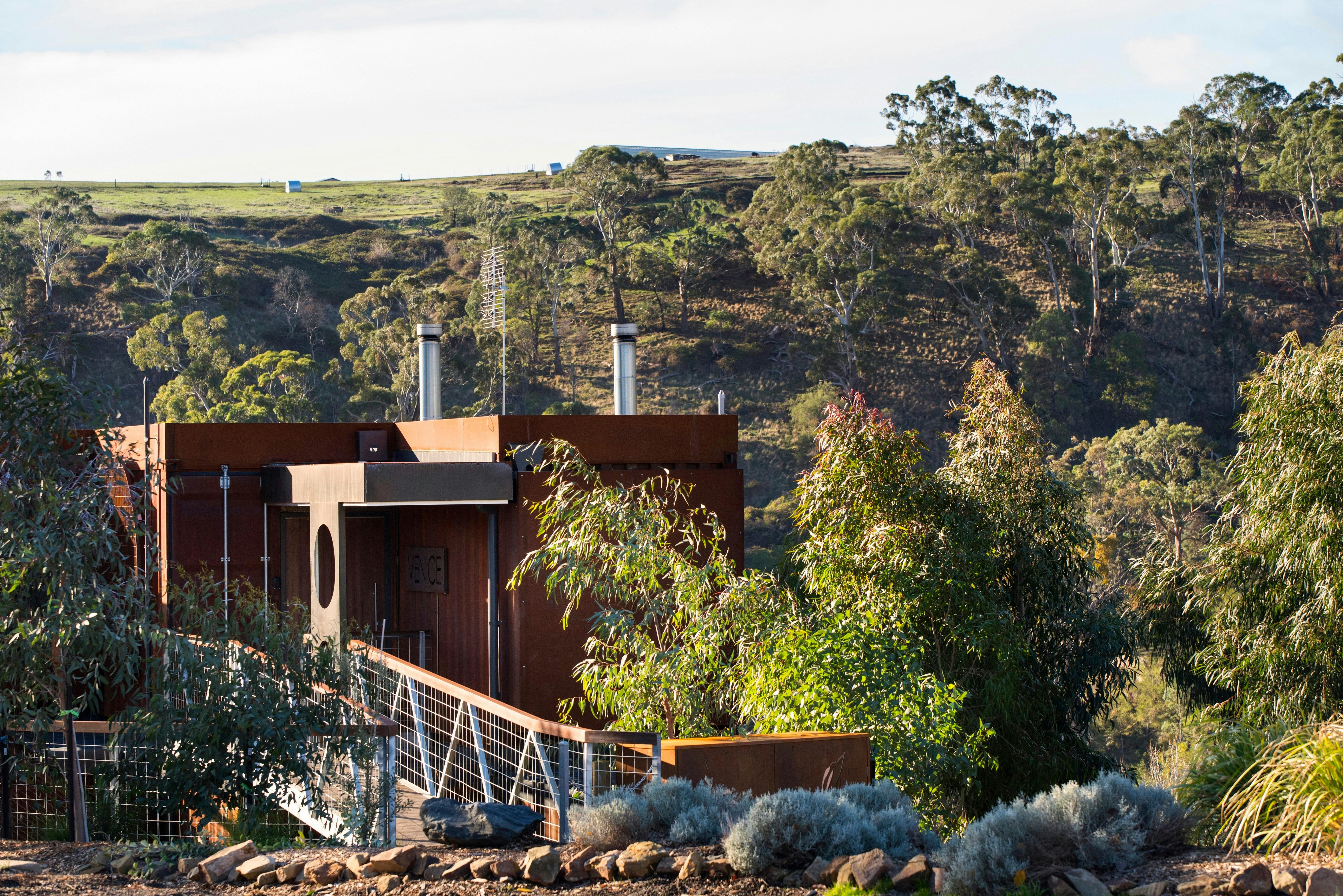 5 star romantic oasis with breathtaking views. Visit the world's most romantic cities, in Hepburn Springs. The new Venice shipping container villa will make guests swoon. From the sheer glass floors with waterfall and rockpool views, bottomless infinity daybeds overhanging a spectacular precipice, to the huge chromotherapy waterfall shower and Road Runner diner. These one-of-a-kind villas deliver a unique blend of indulgent romance, homely haute couture and intoxicating design. Free HD Netflix on your stunning 75 inch QLED television, new mesmerising world-class waterfall right at the front door and panoramic outdoor sauna cantilevered over ravine in common area They have left nothing out, from the picturesque setting to the Bose sound system, large screen television, Bison rugs, velvet sofas, iPads with Spotify, award-winning Oblica fireplace, Beni Ourain rugs, cow hides, Icelandic sheepskins and hand-crafted floating bed. Matt Adnate streetart mural, fireplace, PS4 Pro Console, digital mood lighting, amazing French linen, Champagne on ice, chocolates and muesli, tea, coffee, milk and mineral water