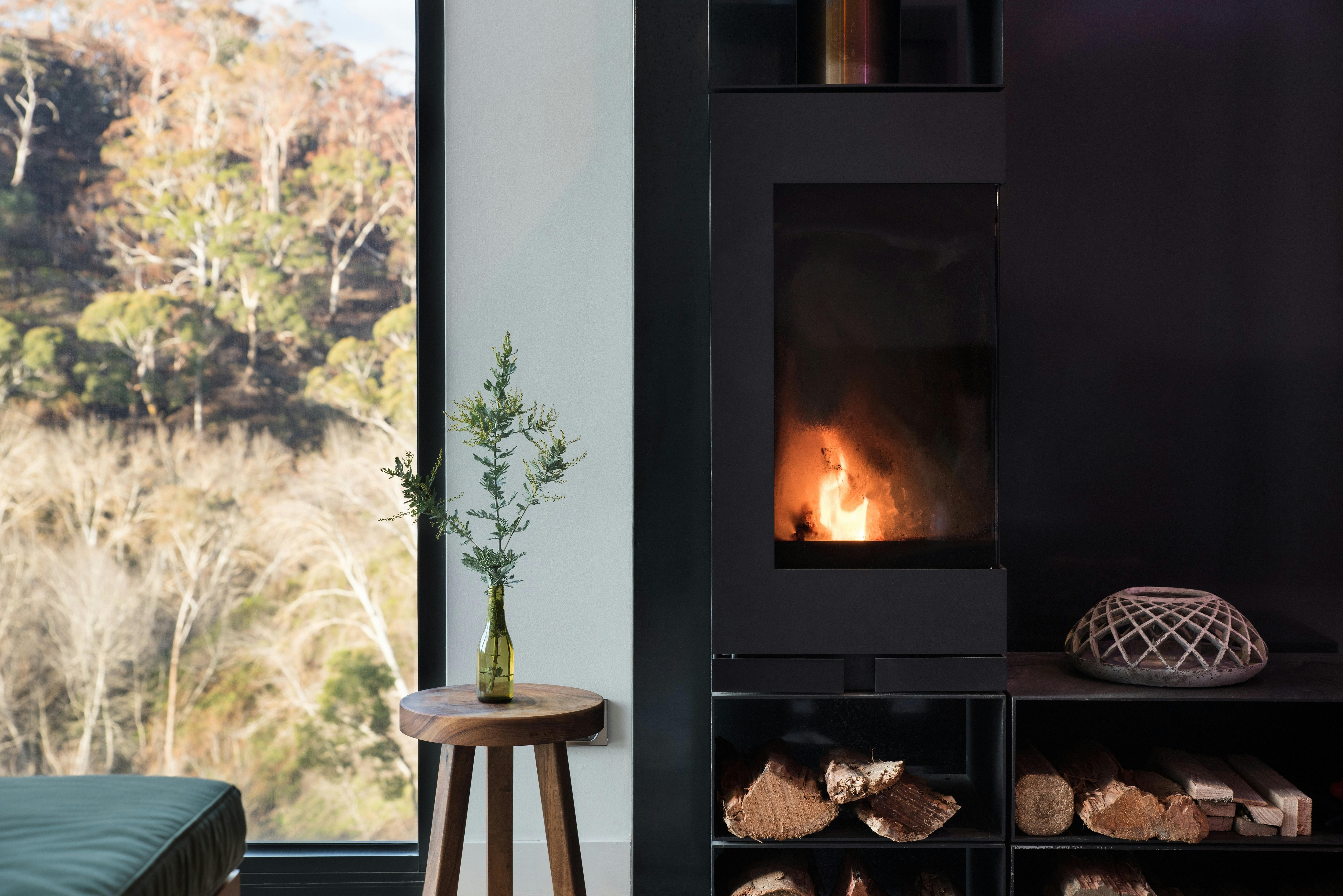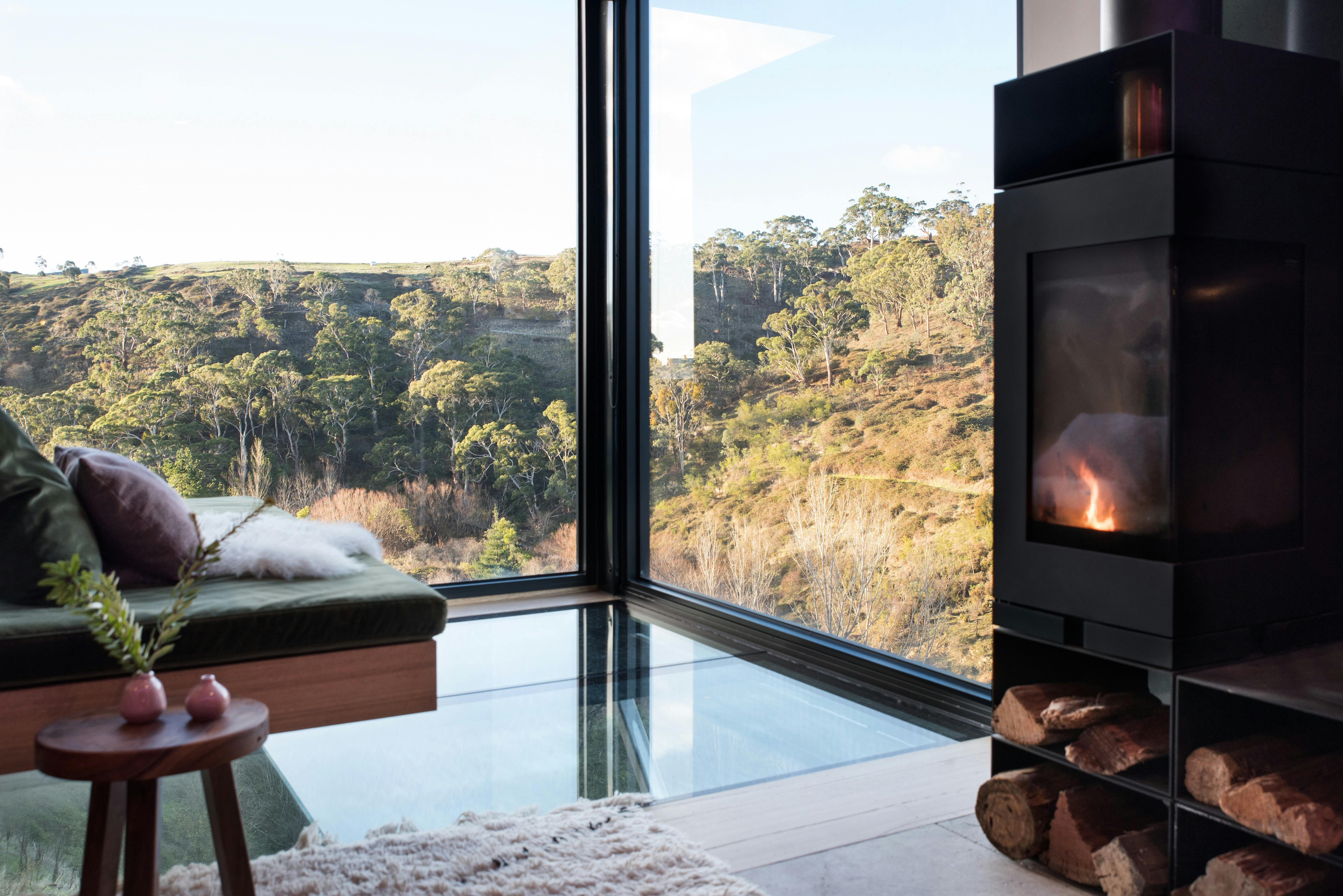 Infinity daybeds and glass floors next to the wood fire