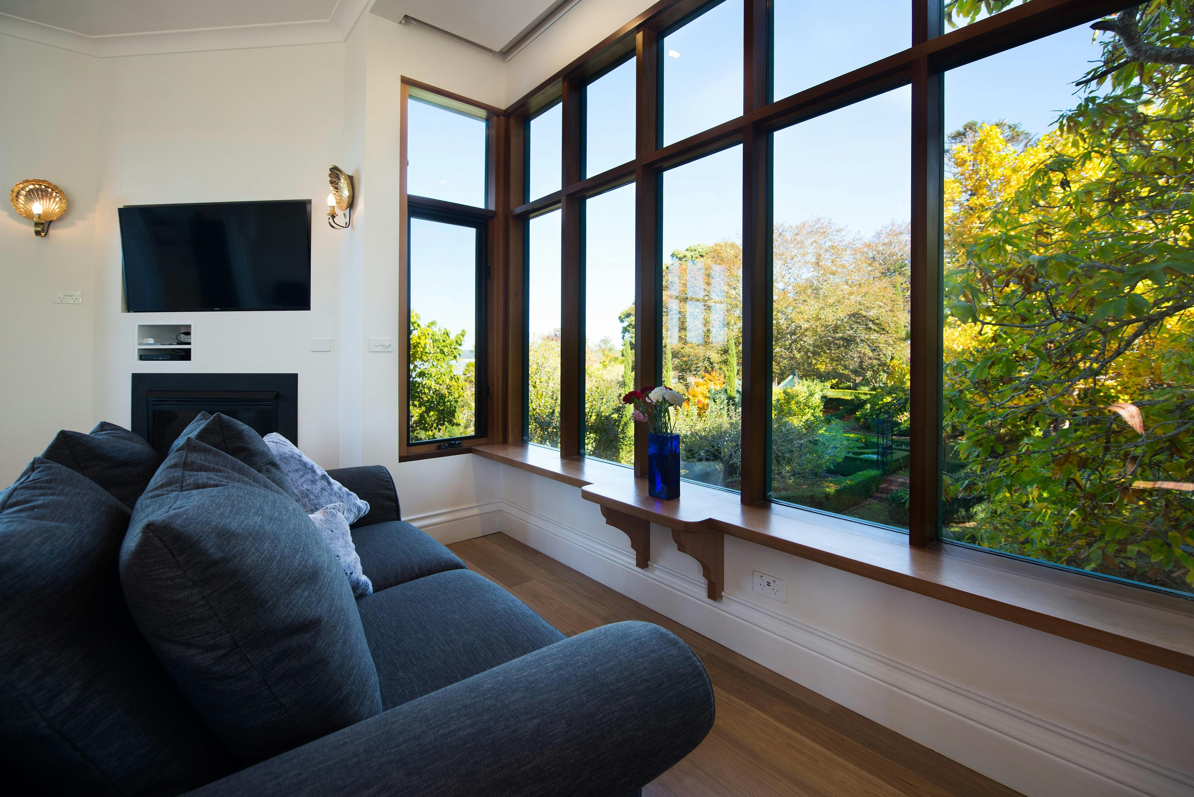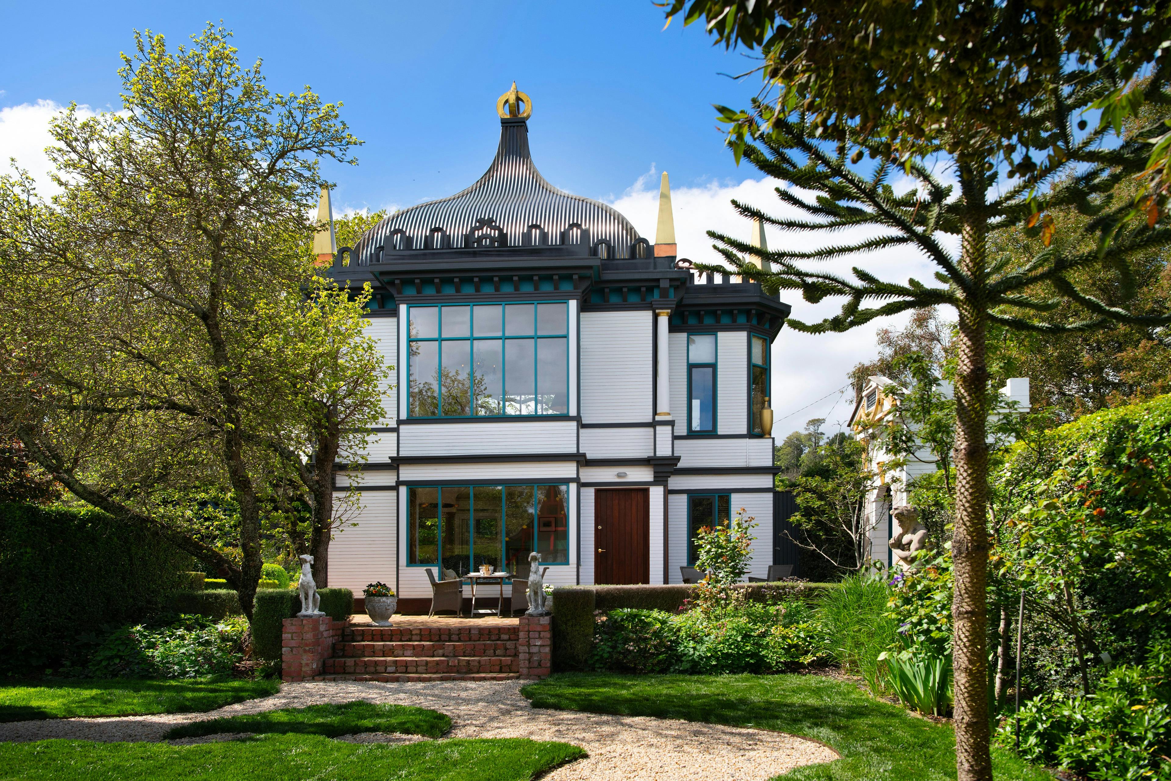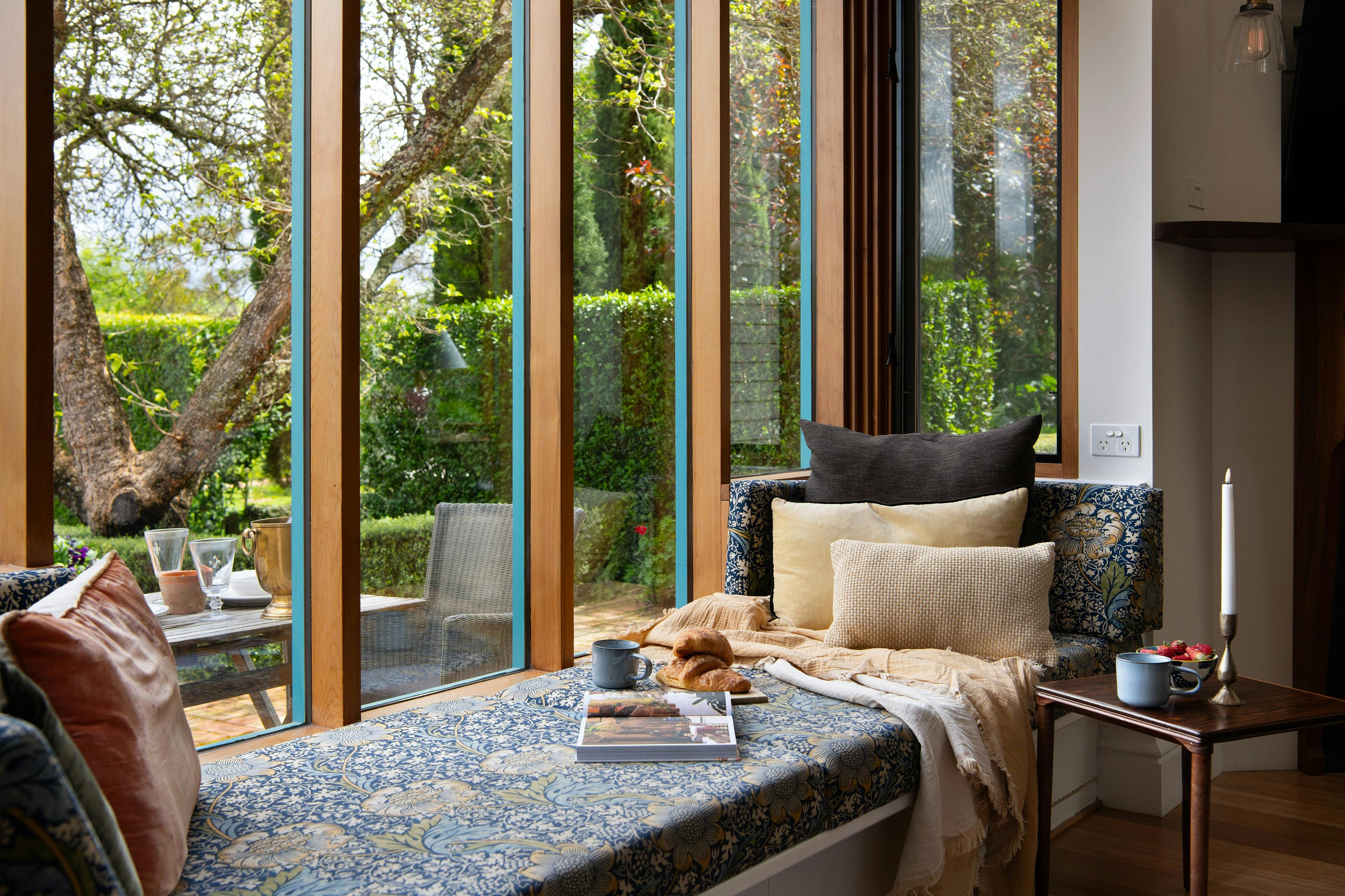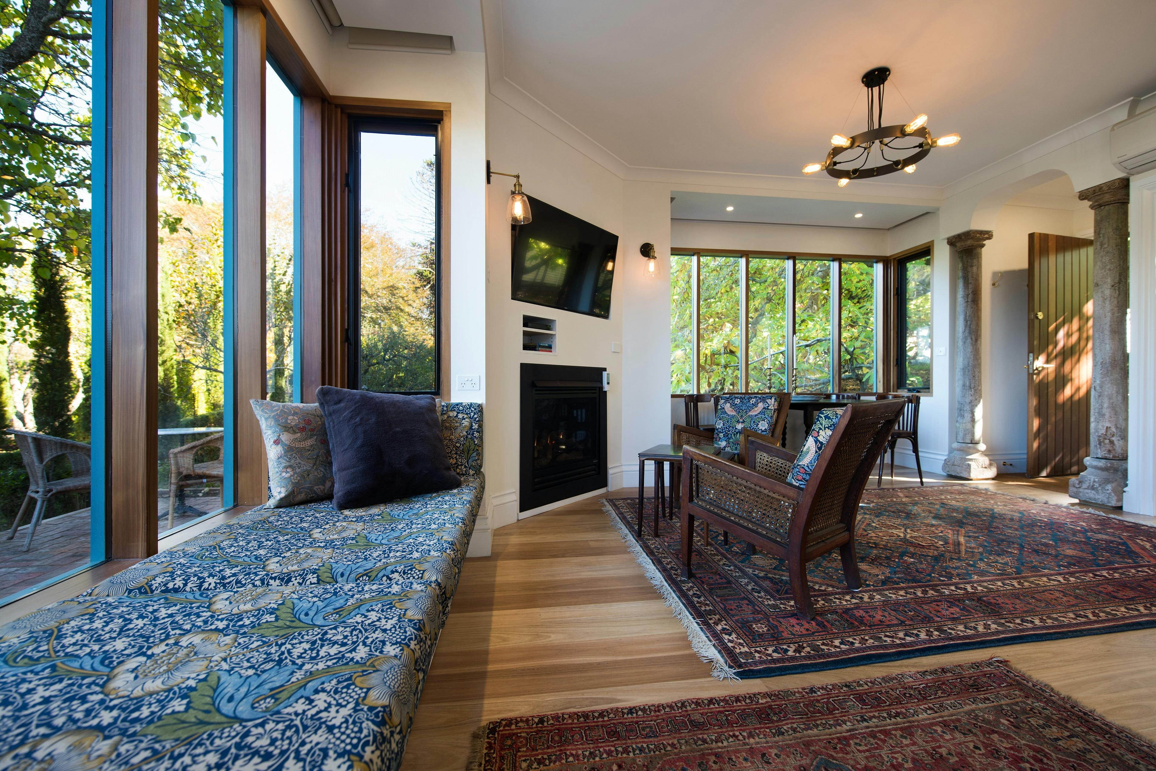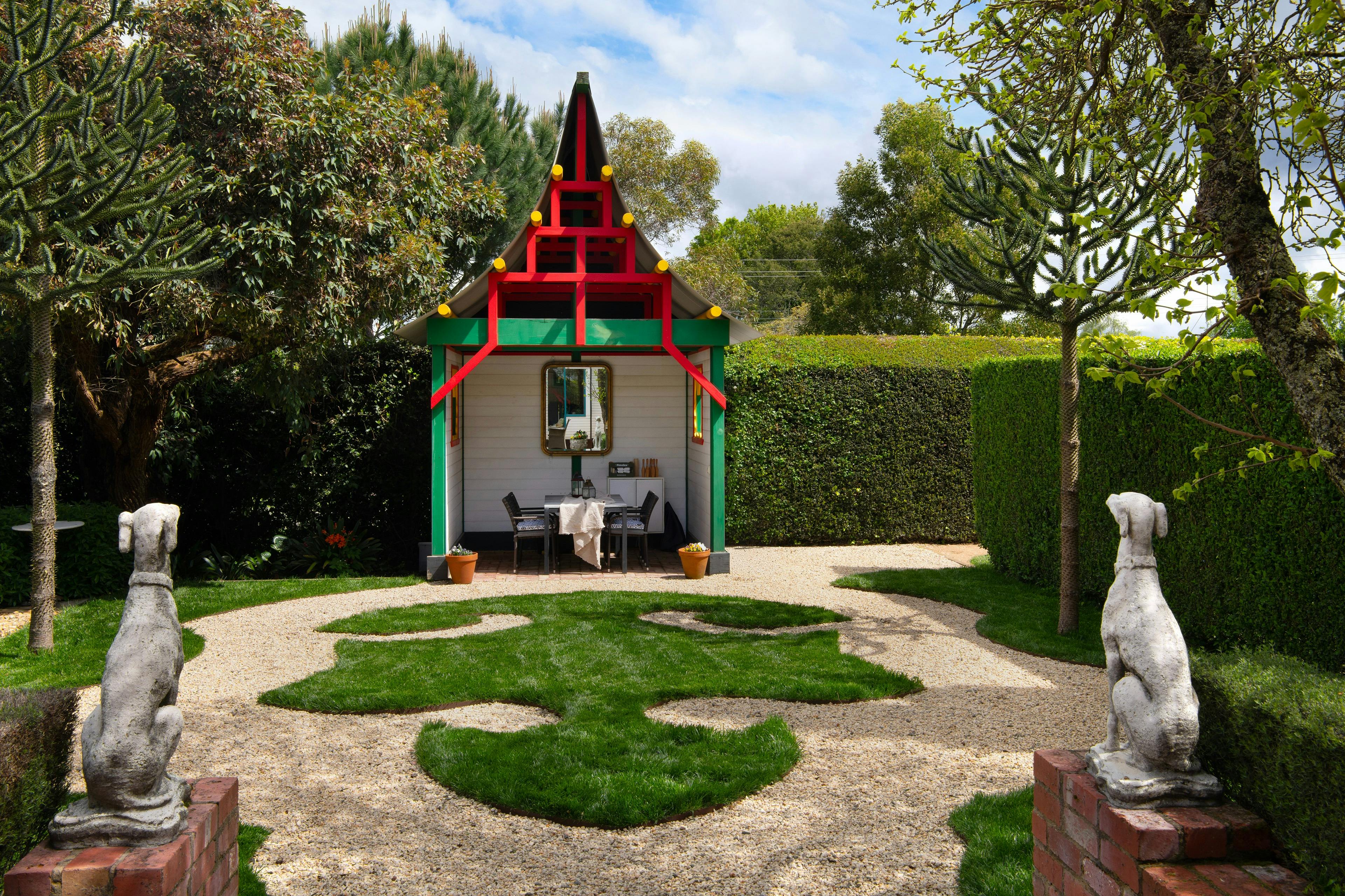 Inspired by classic English country houses, Montacute Garden Pavilion rises majestically among ancient chestnut trees in Daylesford's most magical garden. From the light-filled and spacious king bedroom upstairs, windows on three sides showcase views of the garden below. The dramatic black and gold bathroom inspired by an Art Deco aesthetic, with its spectacular shower niche and bath for two, provides an intimate and sensuous environment, perfect for wedding nights, proposals or a quiet weekend away. Downstairs a second king/twin bedroom with ensuite and a living area with a fully equipped kitchen makes Montacute perfect for longer stays with friends or family. The extensive garden combines mature European trees with formal features such as parterres and statues. With numerous spaces to relax or play in, the garden enfolds guests in each of its seasons: fields of daffodils in spring, leafy summer shade, misty views of the bare branches of the trees in winter, and striking autumn colour. Located within walking distance to Wombat Hill Botanical Gardens, Farmers Arms Hotel and the iconic Cliffy's Emporium. Montacute Garden Pavilion is not just a place to stay, it's a story to step into. Luxurious two bedroom accommodation offering an escape that's woven through whimsical gardens, where every moment feels like a chapter in your own fairytale.