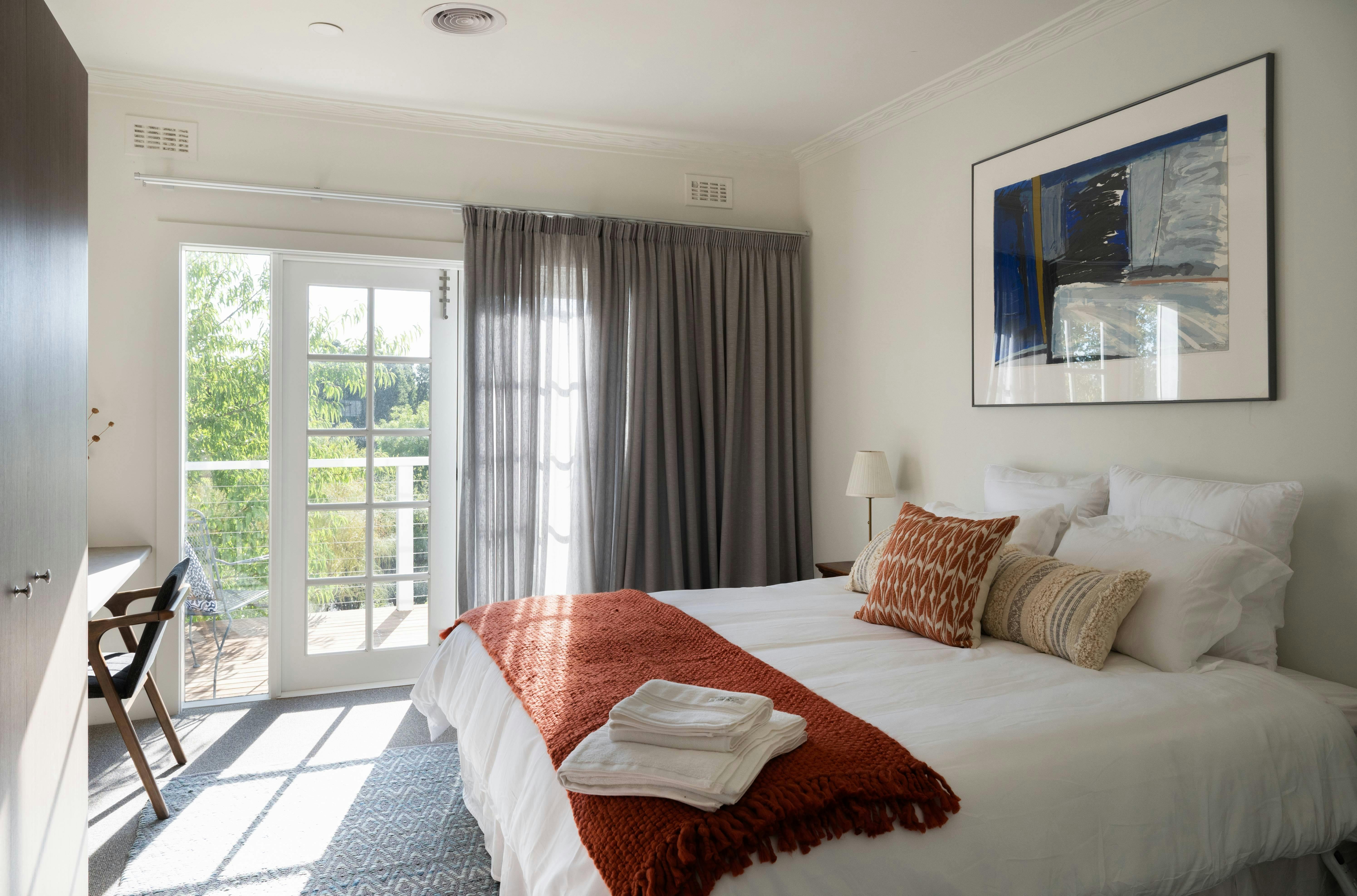 Conveniently located just 30 minutes from Daylesford, 25 minutes from Ballarat, and 10 minutes from Creswick, this charming getaway is the perfect base for exploring the region's picturesque country towns. Escape to a luxurious 2-bedroom retreat in Clunes, Victoria, where private balconies offer stunning views of the surrounding landscape near Mount Beckworth.Designed for couples and young families, this luxury accommodation provides all the creature comforts you need to relax and unwind while embracing life at a gentler pace. Whether you're enjoying a morning coffee or unwinding in the evening sun, these spaces are designed for relaxation. From the open-plan living area, step through French doors onto the sunlit deck, where a cozy nook awaits—perfect for quiet chats or losing yourself in a good book. On cooler nights, gather around the wood heater, creating the perfect atmosphere for a night in. Enjoy the included Netflix or compete in board games with family and friends. Two modern bathrooms offer the ultimate indulgence. Both feature freestanding baths—designed for two—where you can let the day's stress melt away as you soak in peace and quiet. The house comfortably sleeps up to six guests, with a fold-out couch in the living room ensuring everyone has their own space to relax.