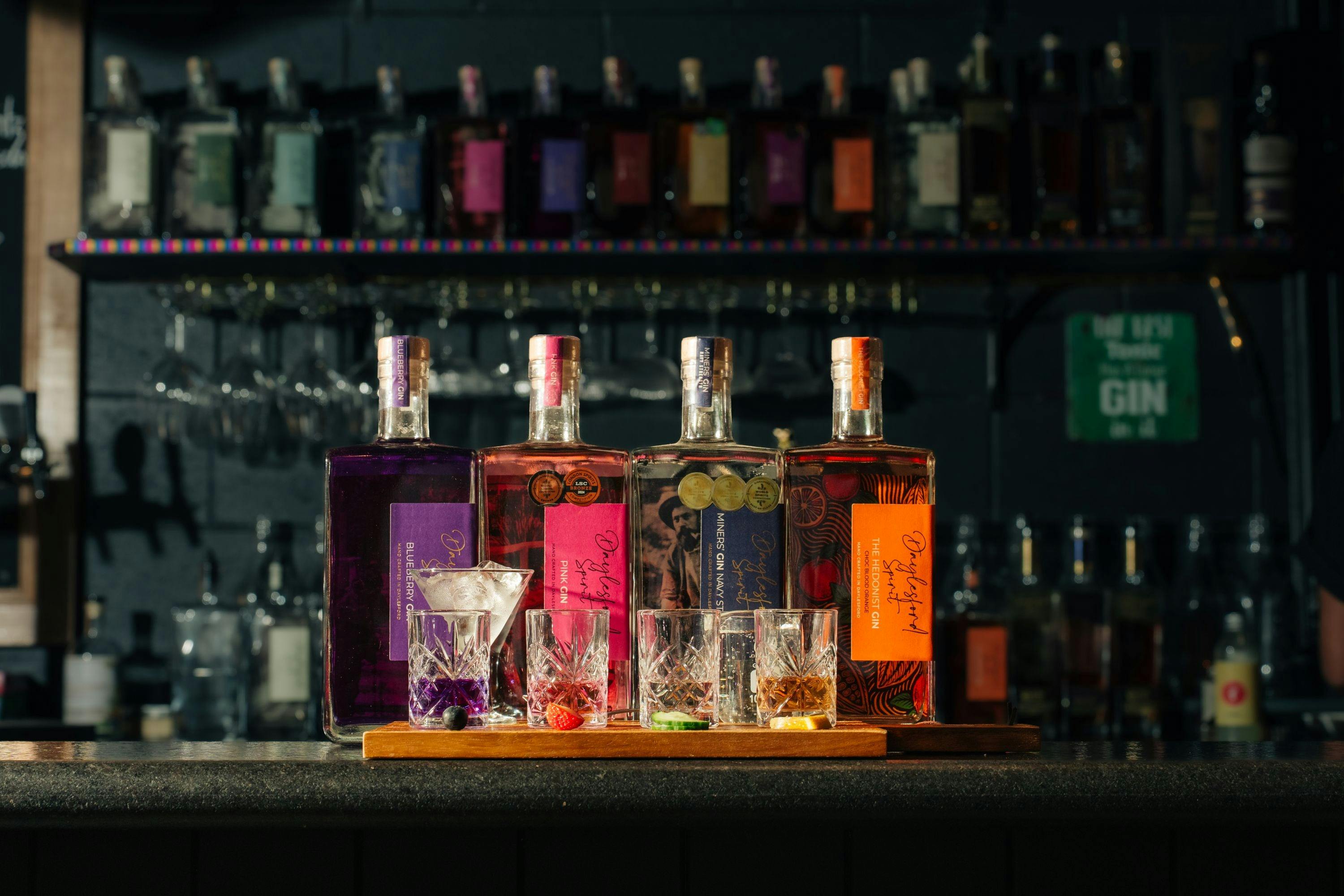 A Gin flight with bottles of gin behind