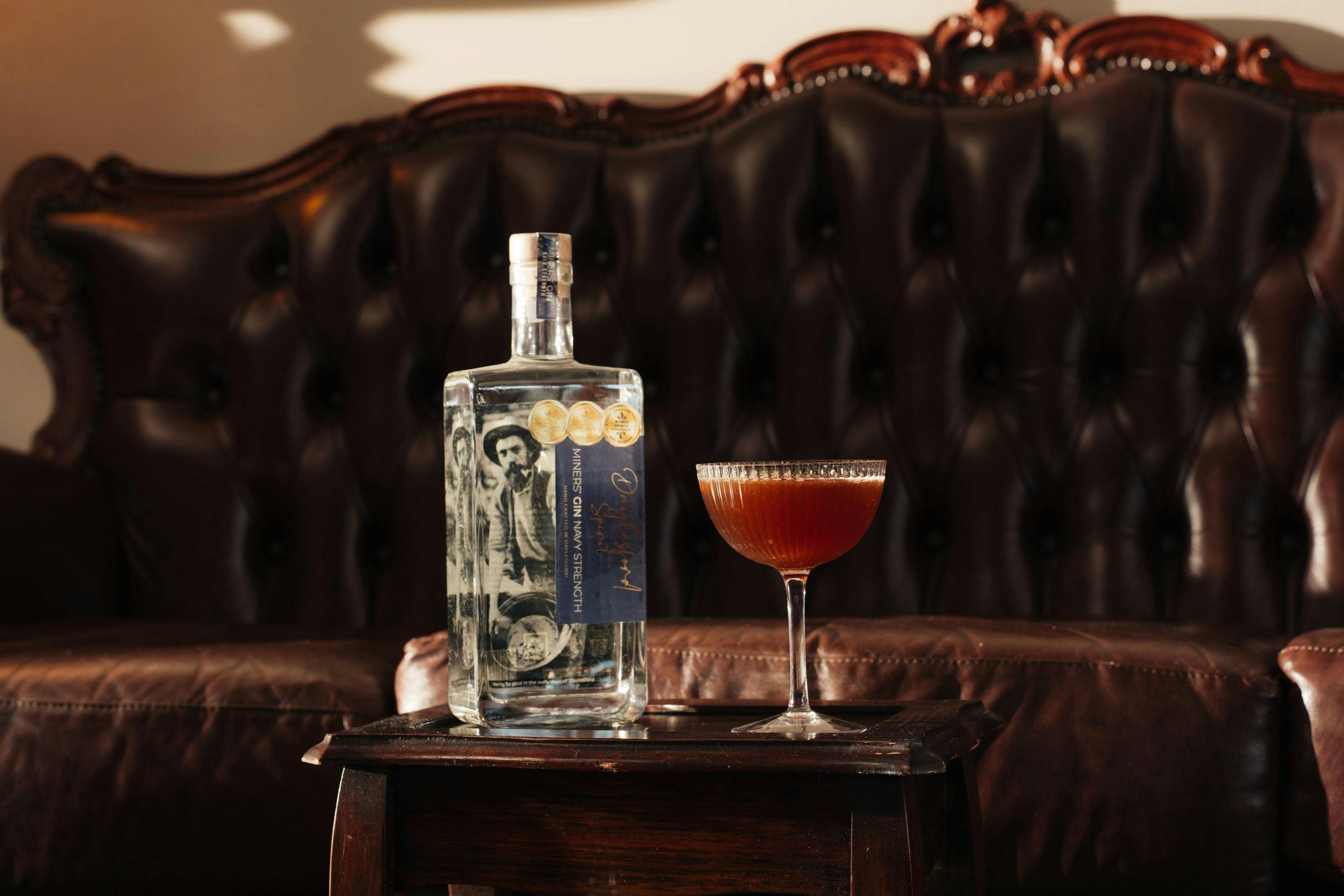 A cocktail with a bottle of Daylesford Spirit Miners Gin behind