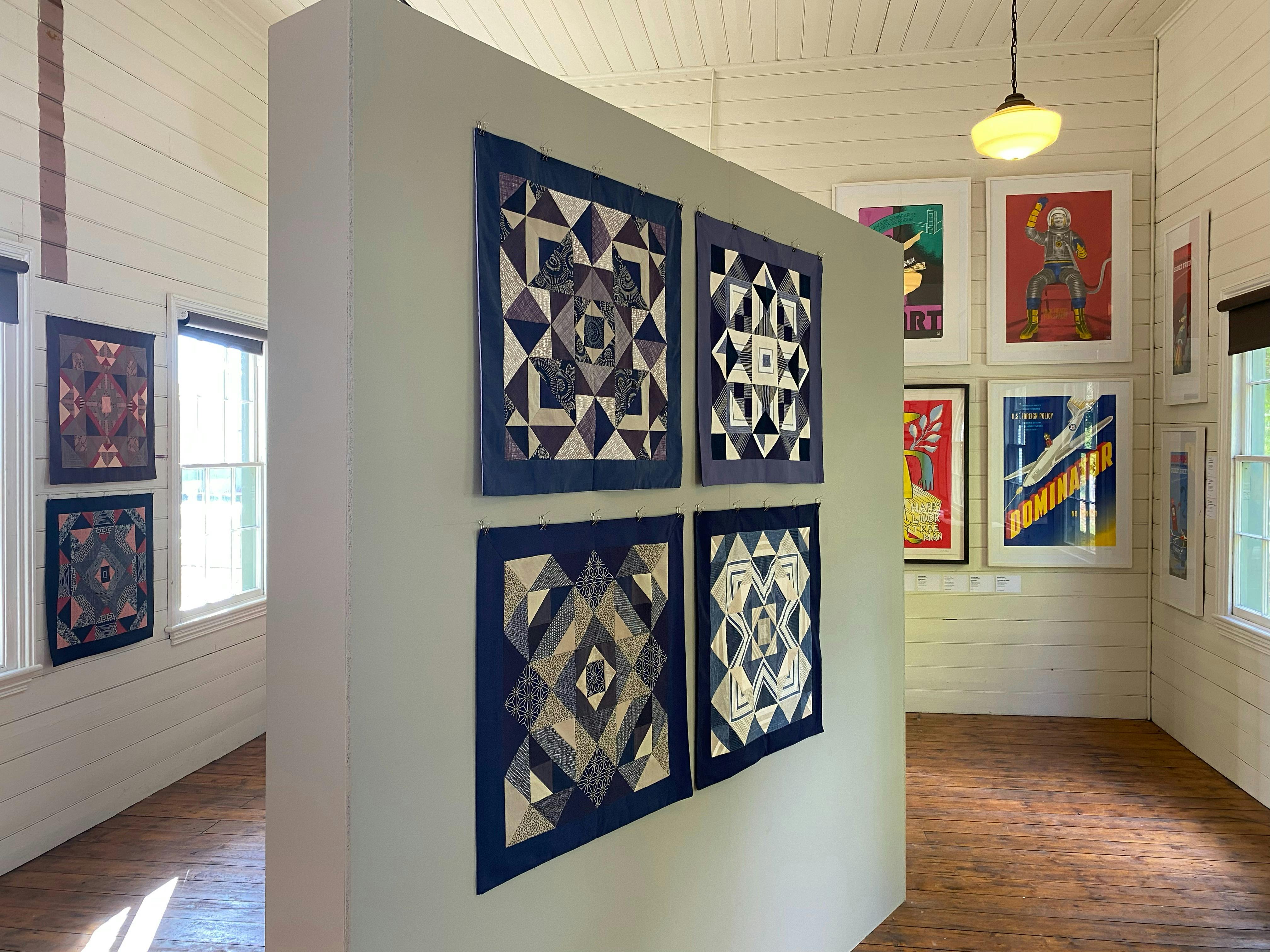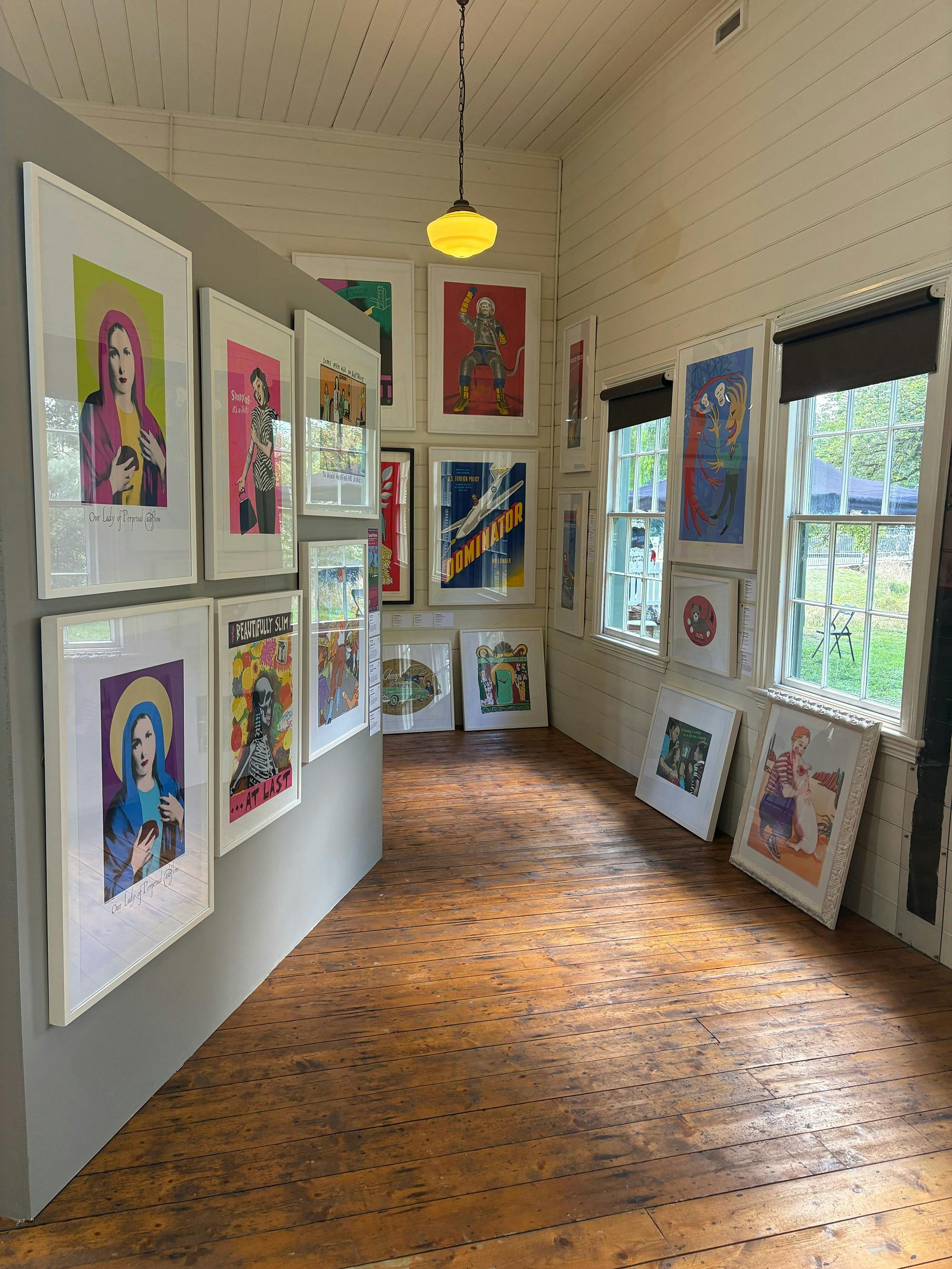 Vibrant screenprints hang salon-style, filling the heritage timber gallery floor to ceiling.