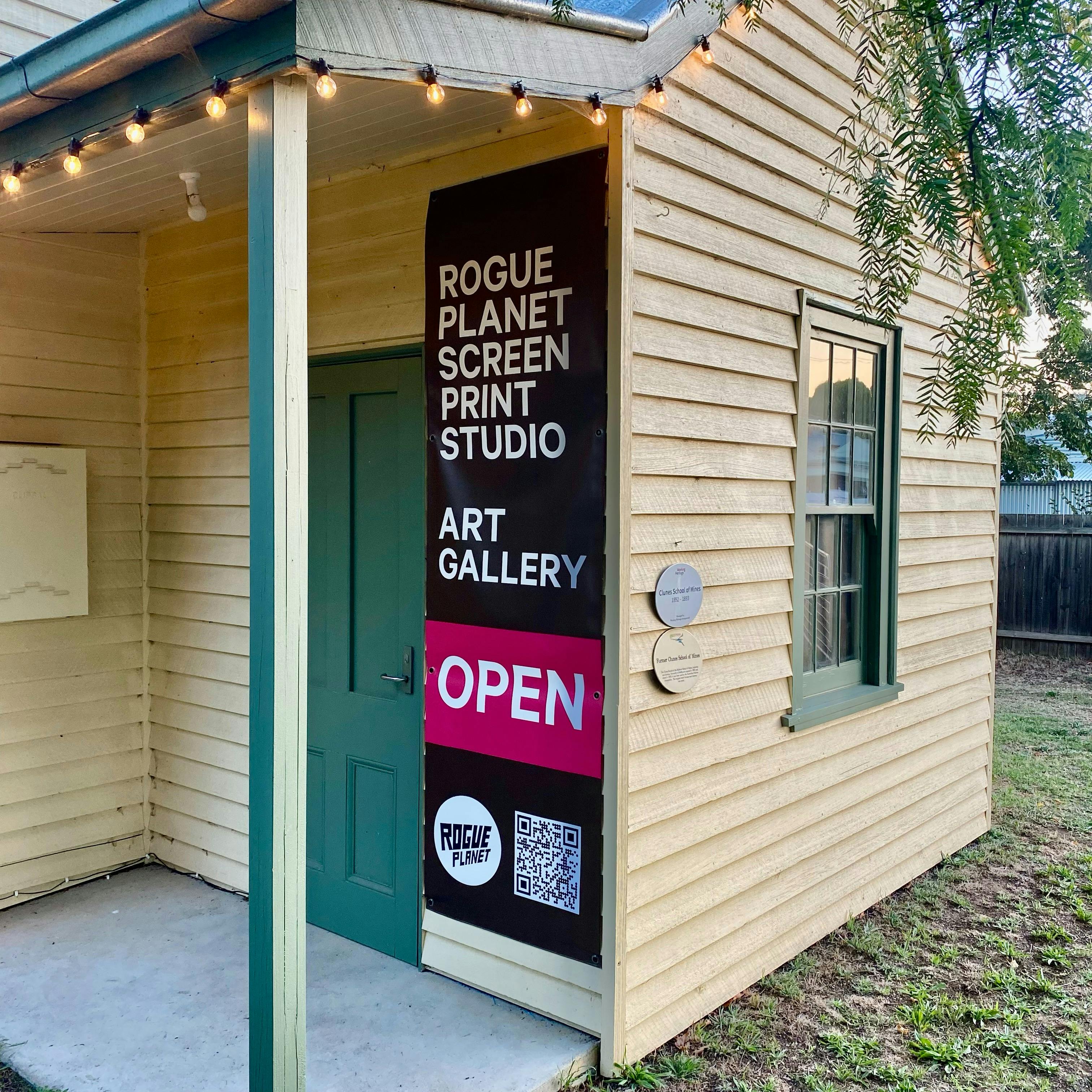Rogue Planet is a screenprint studio, gallery and creative hub nestled inside a beautifully restored piece of Victorian goldfields history. The former Clunes School of Mines building dates to 1892, and still features original wall stencils and historic gold-smelting furnaces. It is one of only two schools of mines remaining in Victoria. Visitors can explore a welcoming gallery space showcasing the work of local and visiting artists. Original prints, paintings and handcrafted works are available to browse and buy. Monthly shows bring a rotating program of exhibitions, meaning there is always something new to see. Rogue Planet also runs hands-on workshops in screenprinting and other creative skills, suited to all experience levels. Talks and community events are held throughout the year. There is always something to discover. The building sits creekside in Clunes, one of the most architecturally intact gold rush towns in Victoria. The main street is lined with heritage buildings, independent shops and cafes, making Rogue Planet a natural stop on a day trip or weekend getaway. Whether visitors come to make, to browse or simply to soak up the atmosphere, Rogue Planet offers a genuine and unhurried creative experience in a remarkable historic setting.