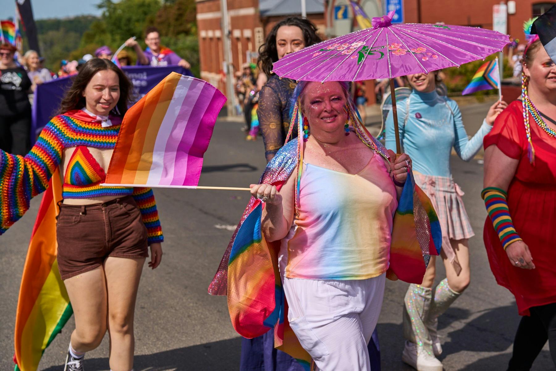 ChillOut Street Parade. People walking in bright colours holding alliance flags and umbrellas