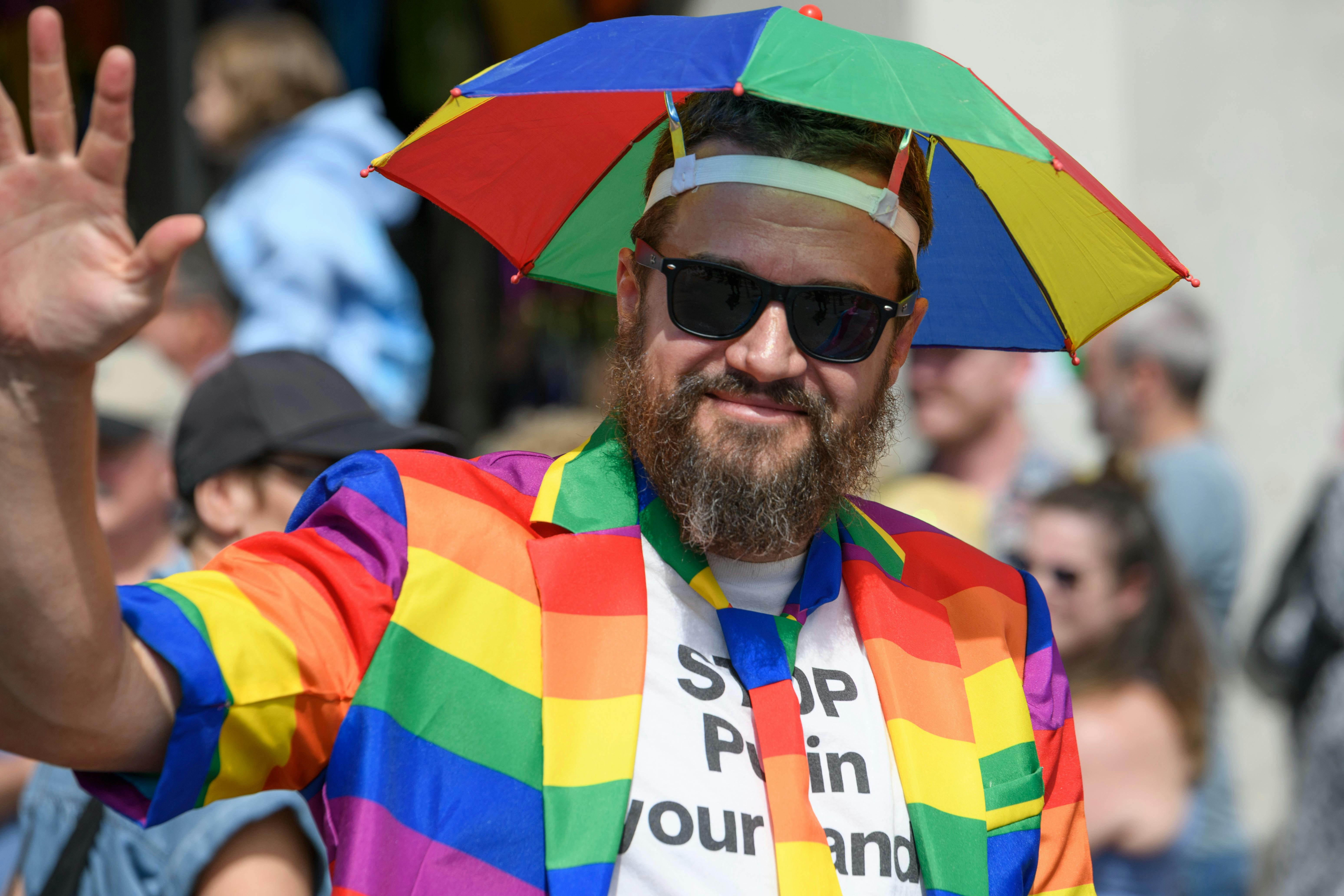 ChillOut Street Parade person wearing a rainbow umbrella hat and rainbow coloured jacket and tie